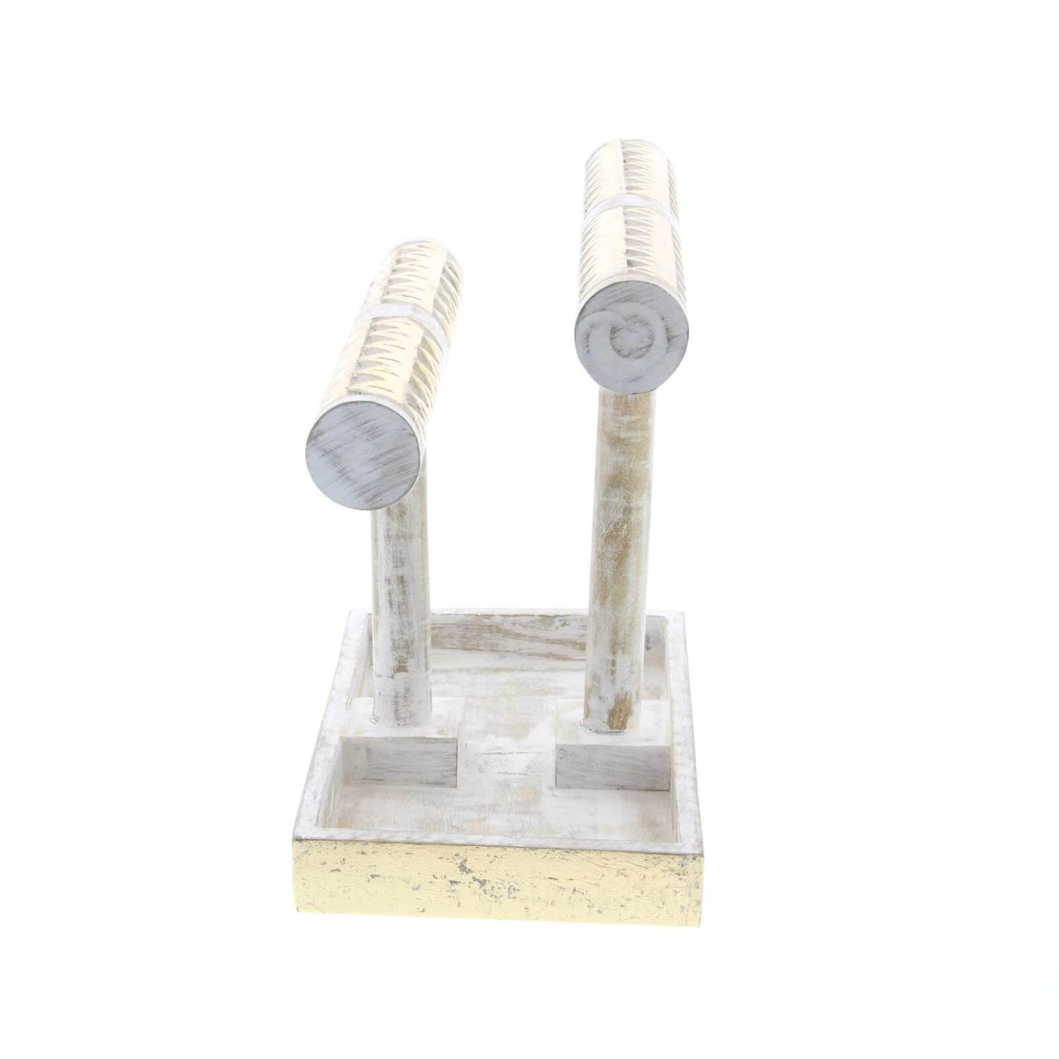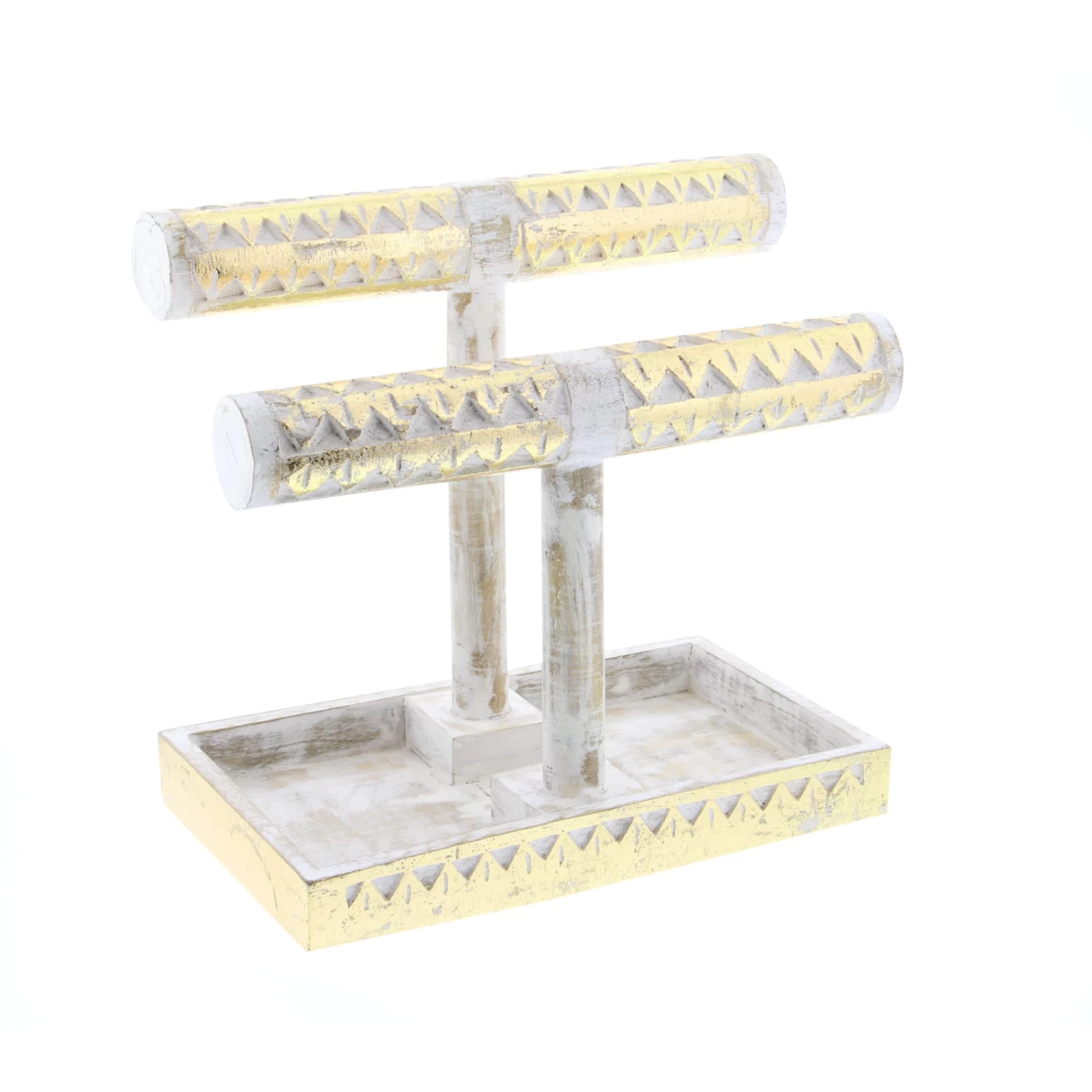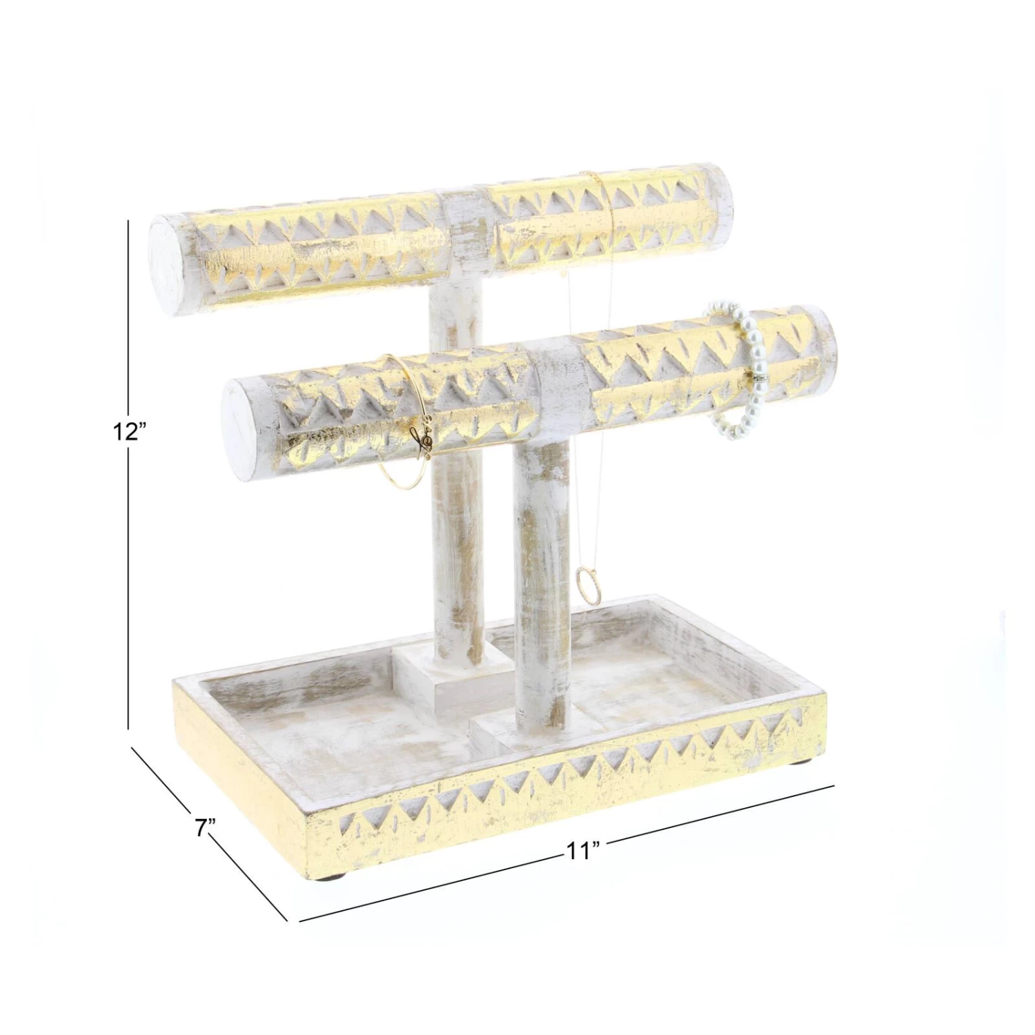 Organize your jewelry without the hassle of tangles with this distressed white and gold jewelry stand organizer. This accent piece is perfect to place on a vanity or dresser.