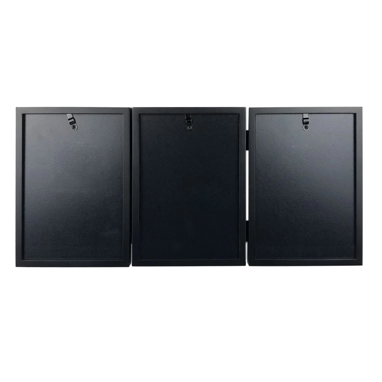 Show off a trio of family photographs. Three black frames are hinged together to create an eye-catching photo display for your desk or tabletop.