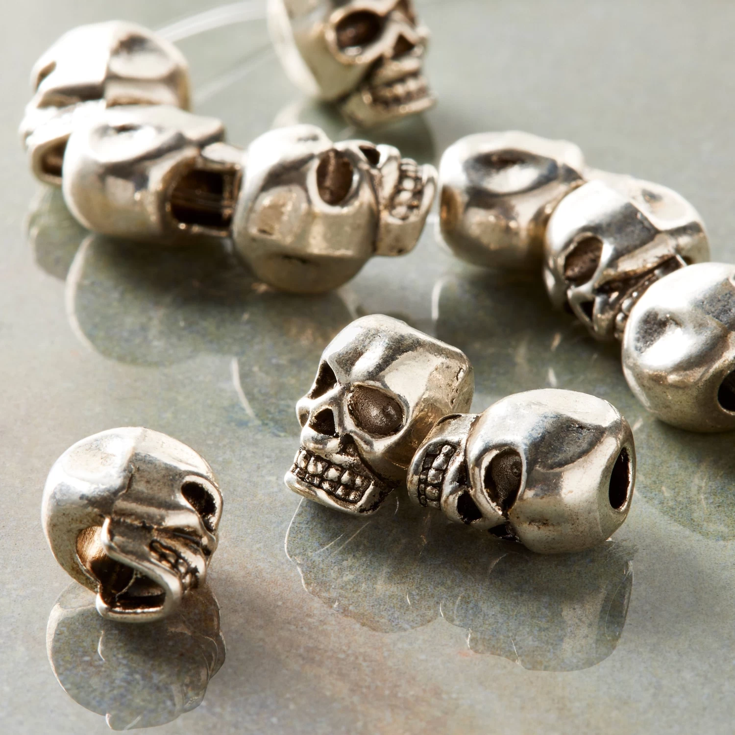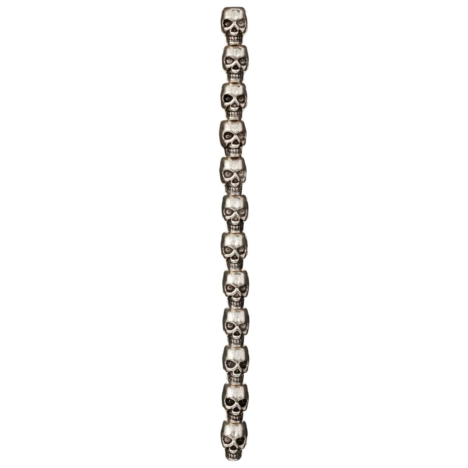 These trendy silver-plated beads feature a detailed skull design. A thin coating of silver is applied before they are antiqued in a lacquering process that blackens the design perfectly. Combine with other beads or a pendant to complete your one-of-a-kind design.