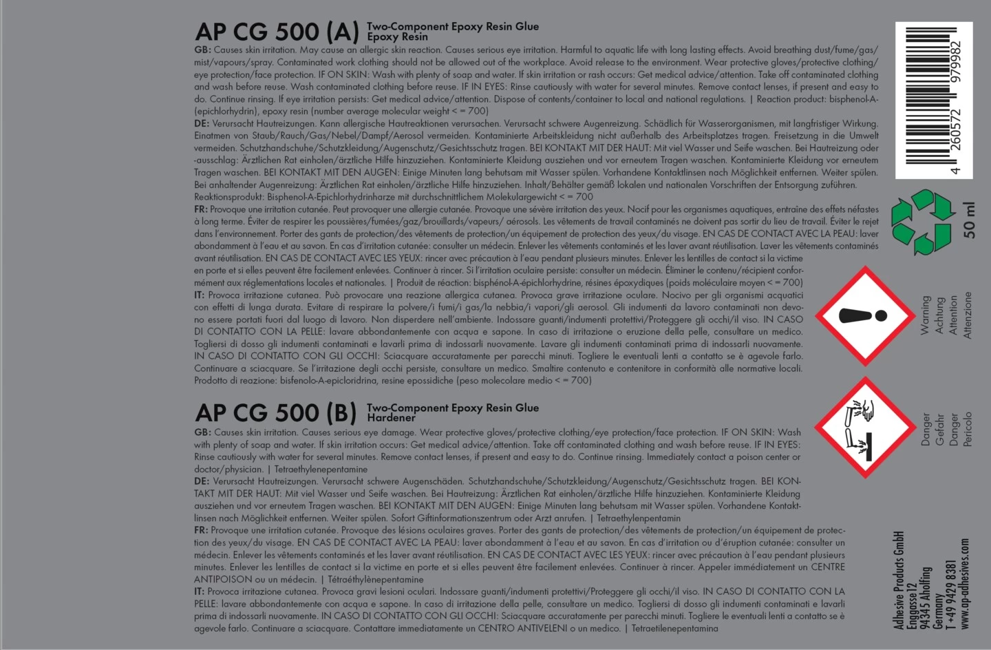 Component A – Epoxy Resin. Component B – Hardener.