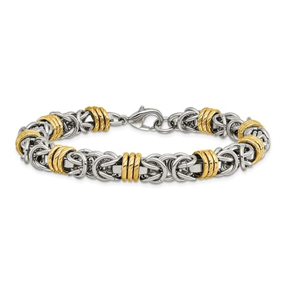 Cool and stylish, this mens 8.25 inch yellow IP plated plated bracelet is crafted from durable polished stainless steel. The perfect piece for adding a trendy edge to every occasion! This steel bracelet weighs approximately 37.00 grams and has a lobster clasp closure..