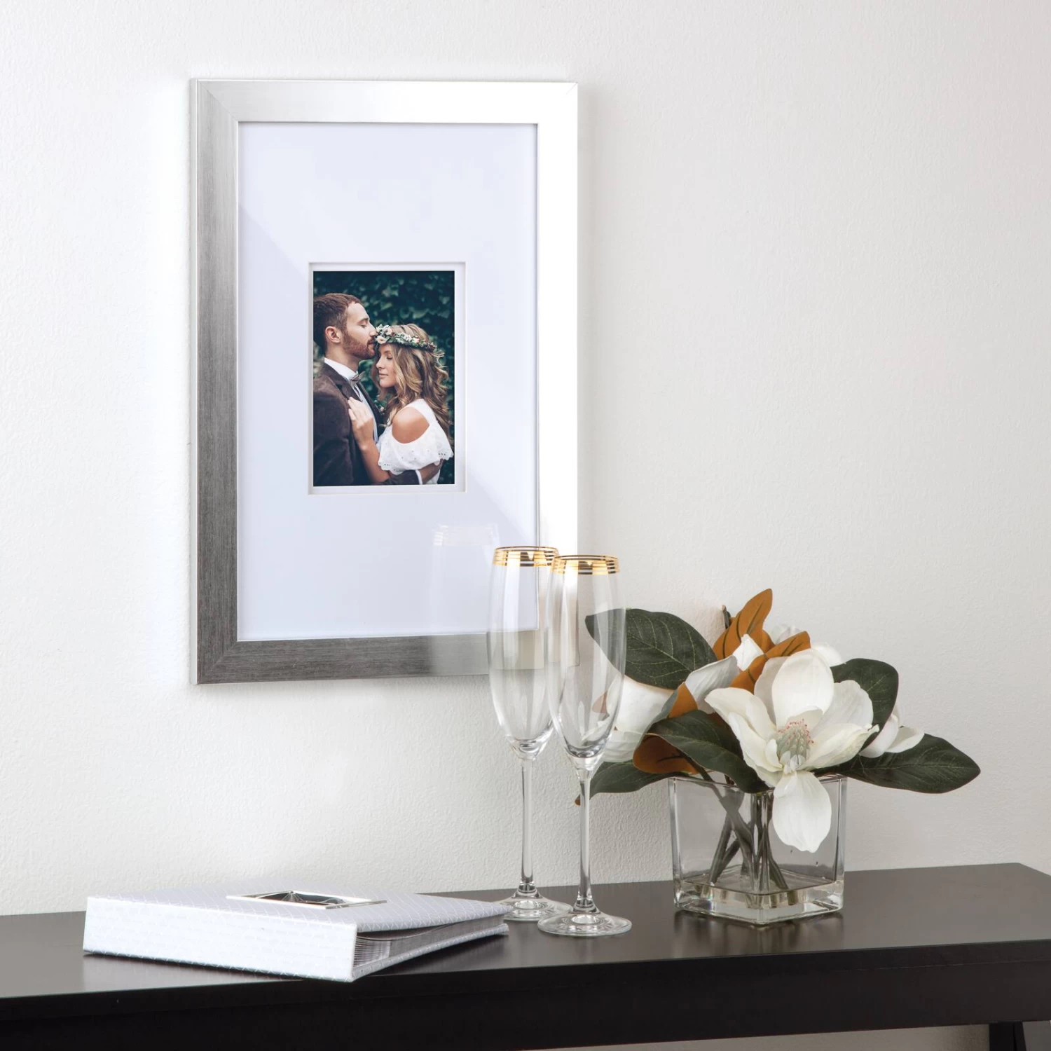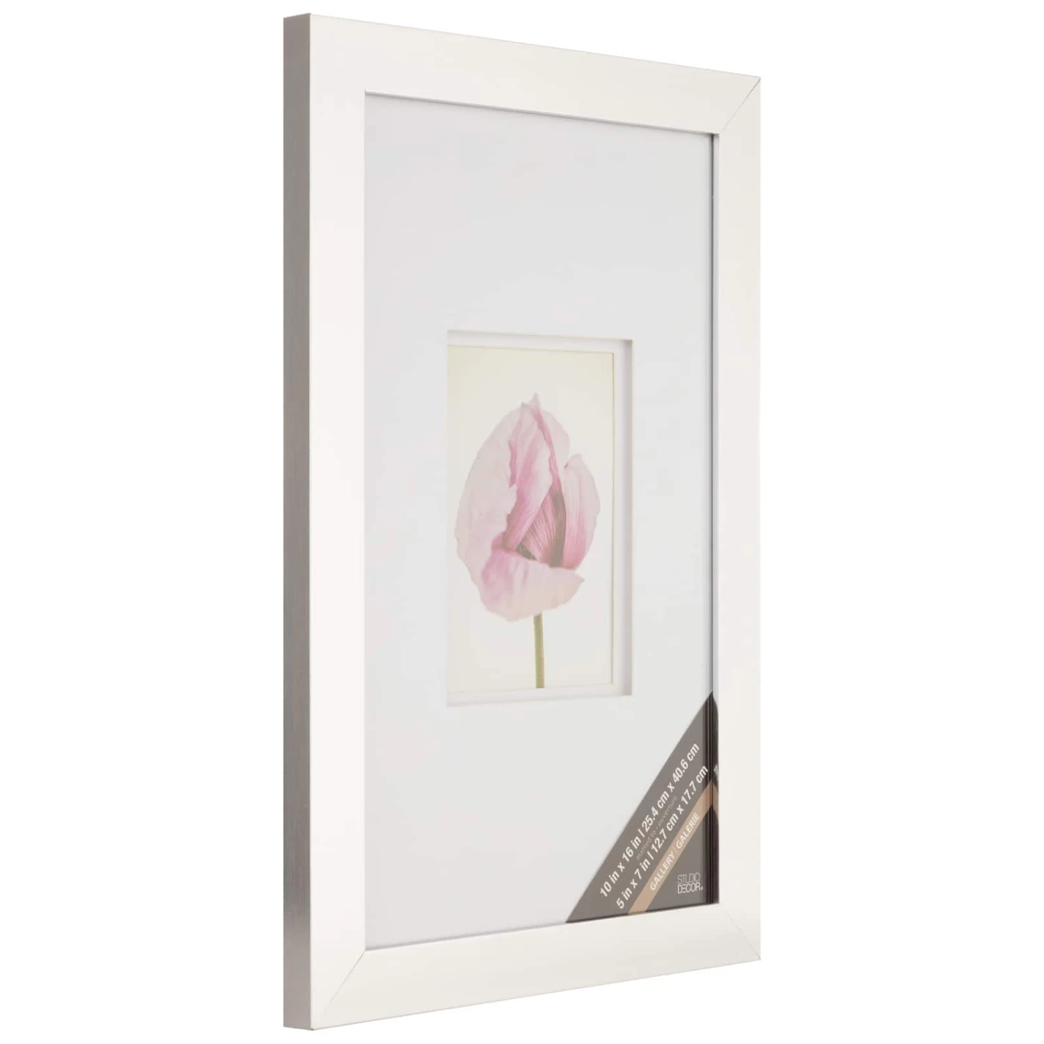 • Silver colored frame with white double mat