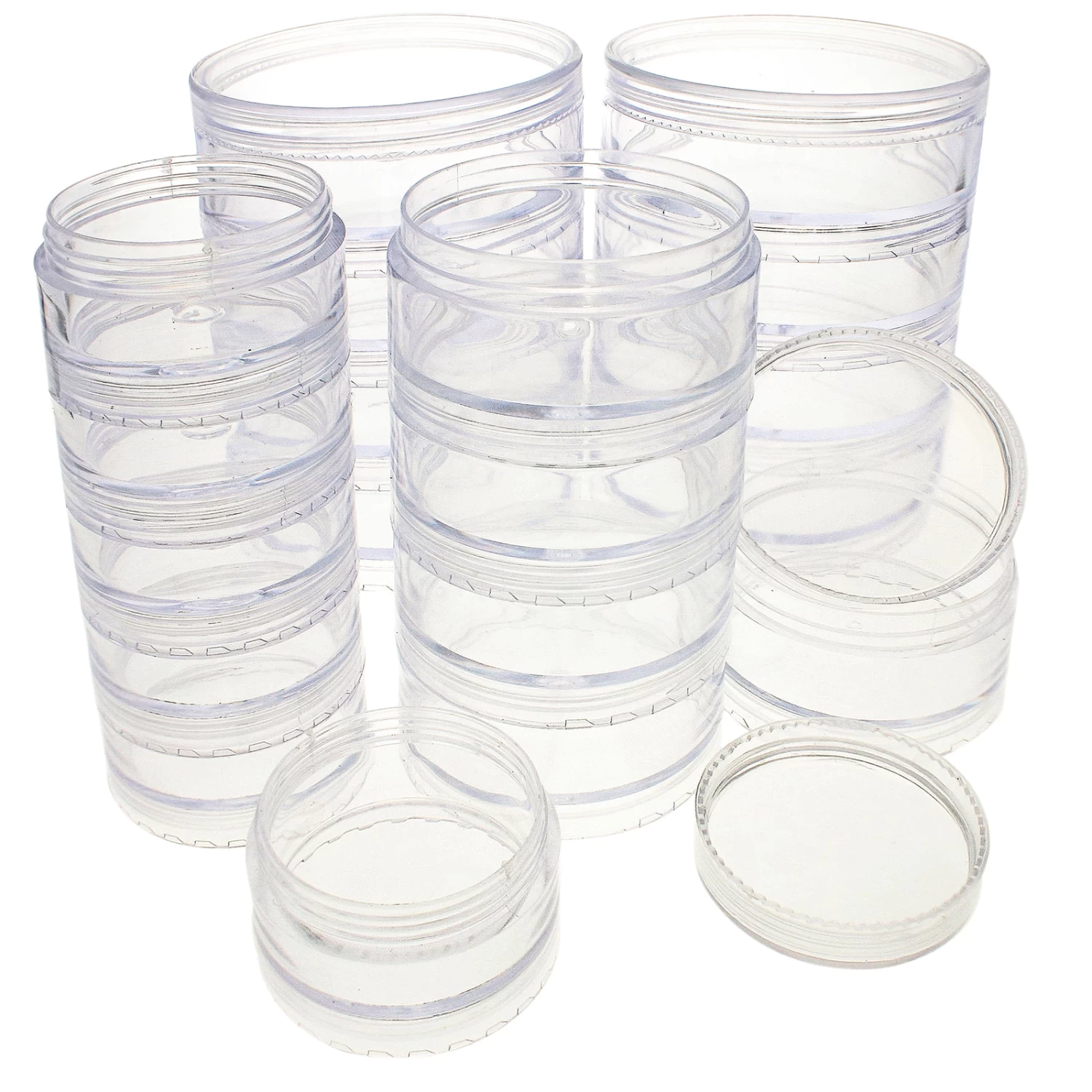 Crystal clear, efficient space saving stack jars have threaded lids which screw into each other for tight and secure storage. Includes one lid with each set.
